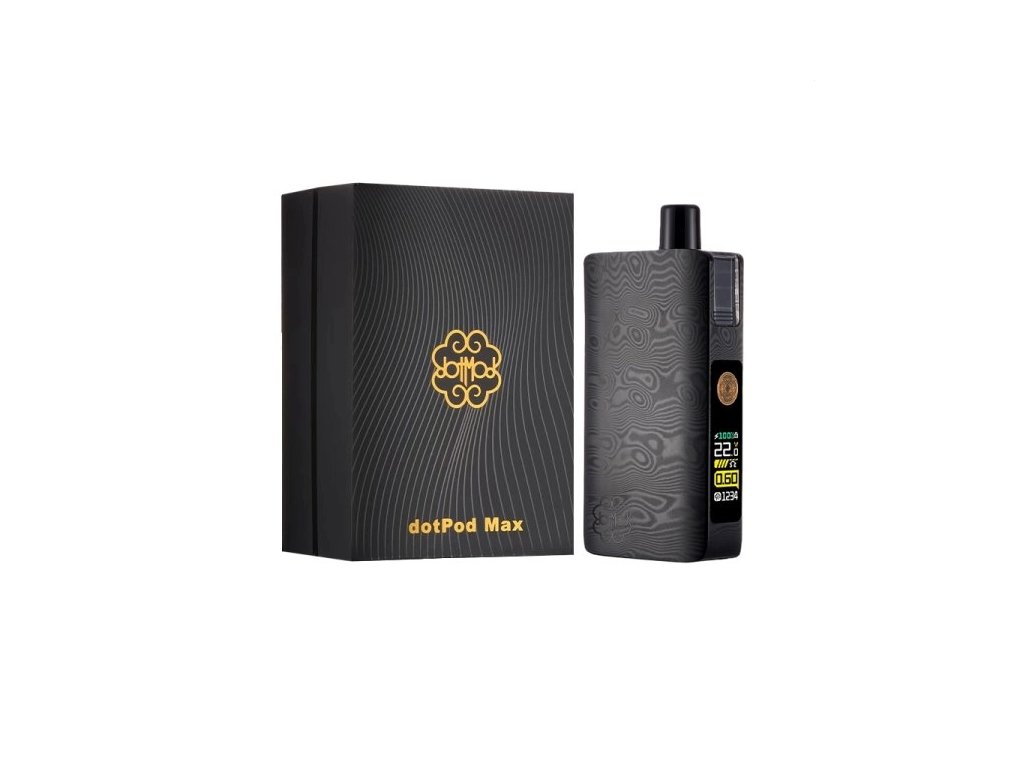 DotMod přichází s upraveným Max PODem. Stejně jako předešlá verze, i DotPod Max V 1.5 pojme plnohodnotné DotCoil žhavící hlavy při stejně kompaktním těle. Zařízení je určeno pro všechny typy potahů. Nabízí dostatečně velkou 2100 mAh baterii, cartridge s objemem 5ml, regulaci tuhosti potahu, aktivaci potahem, přepracovaný displej a USB-C port. Tento kus je navíc v limitované edici Damas, která svým vzhledem napodobuje vzory Damašské oceli.