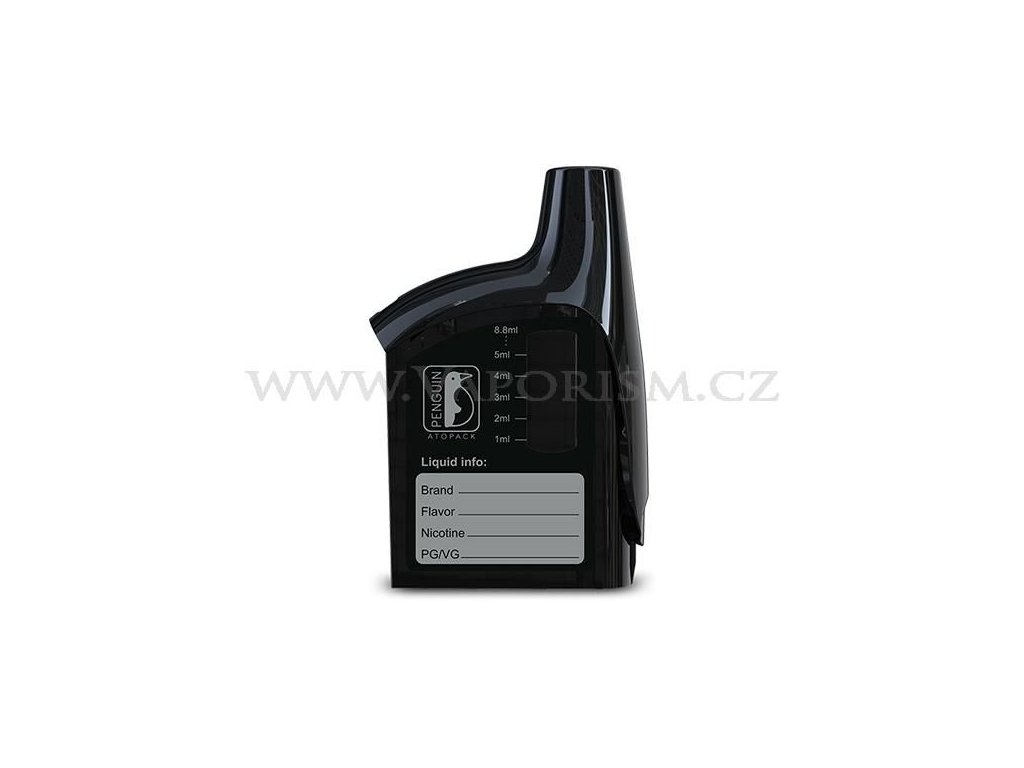 Do cartridge pro Atopack Penguin se nejen plní e-liquid, ale také se do ní vkládá žhavící hlava. Vyrobena je z PETG a silikonu. K dostání je ve dvou variantách, a to 2ml, kterou naleznete i v základní sadě s e-cigaretou, anebo větší 8,8ml. Cartridge zároveň slouží jako náustek a přívod vzduchu.