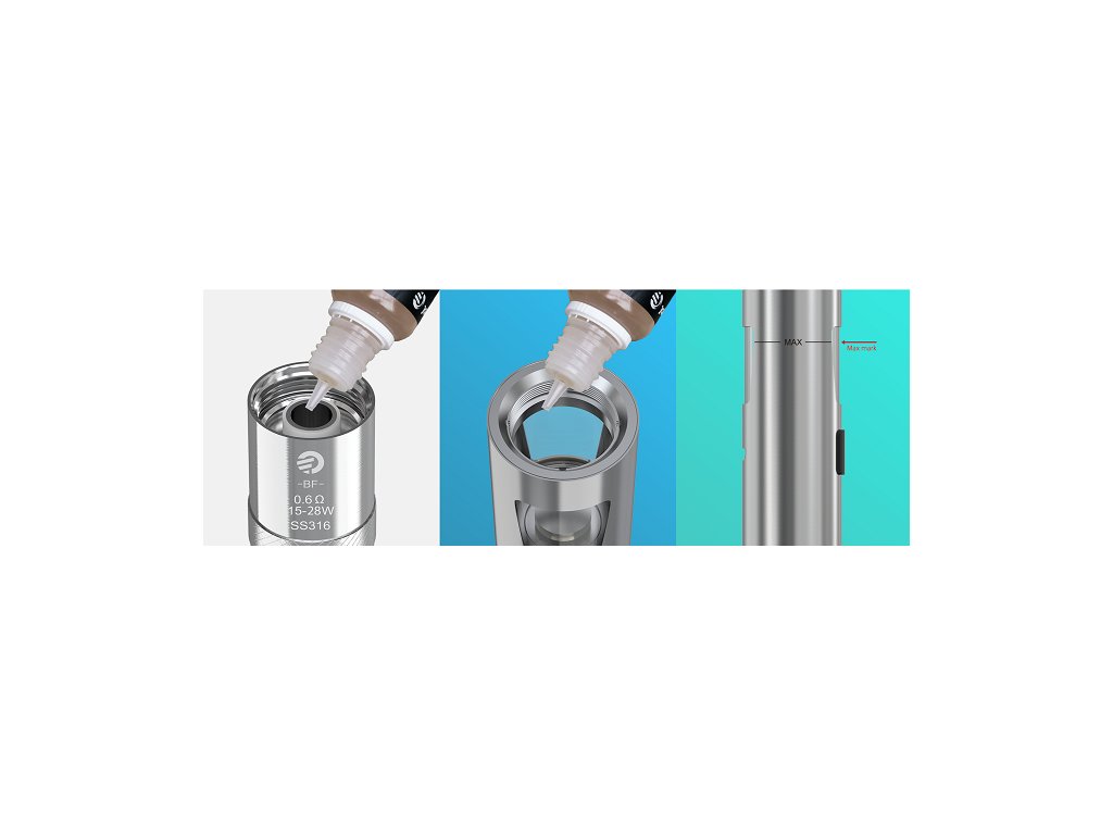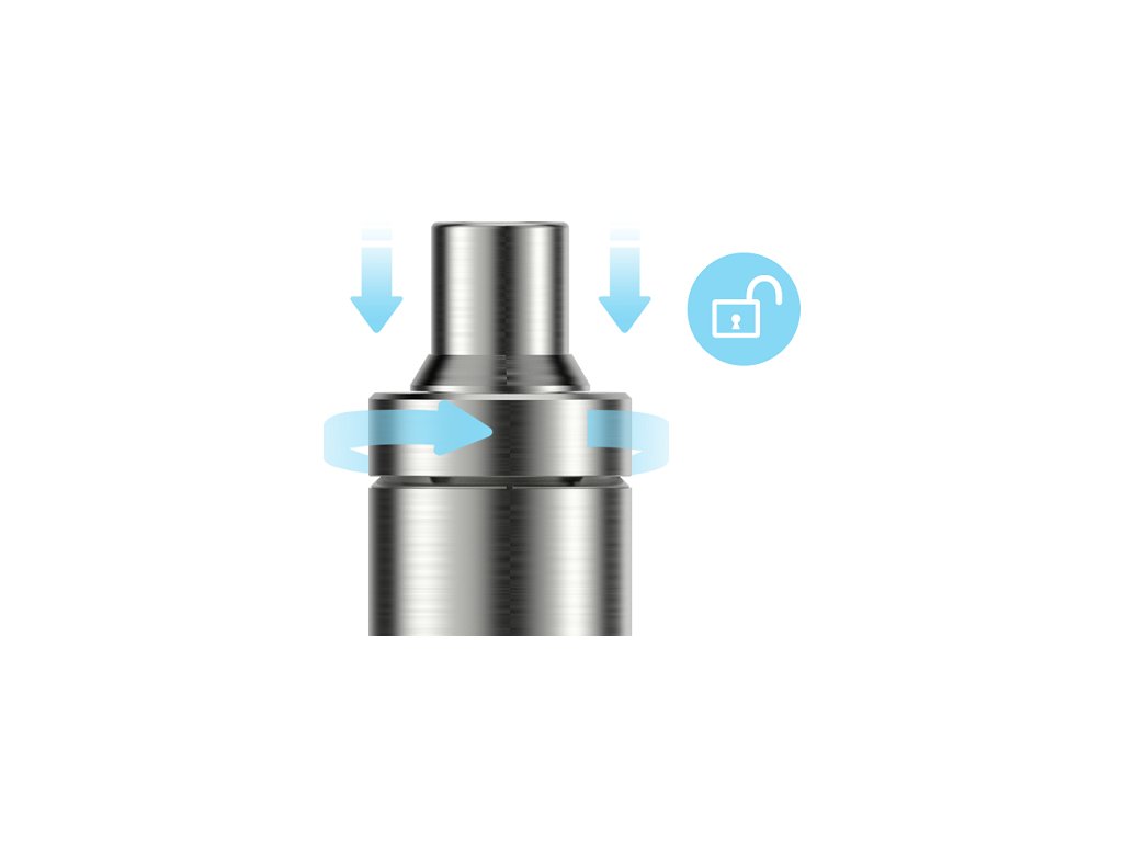 Joyetech eGo AIO D22 XL je vybaveno dětskou pojistkou. Pro odšroubování vrchní části clearomizéru je tak potřeba ji nejdříve zamáčknout směrem dolů a až poté odšroubovat.