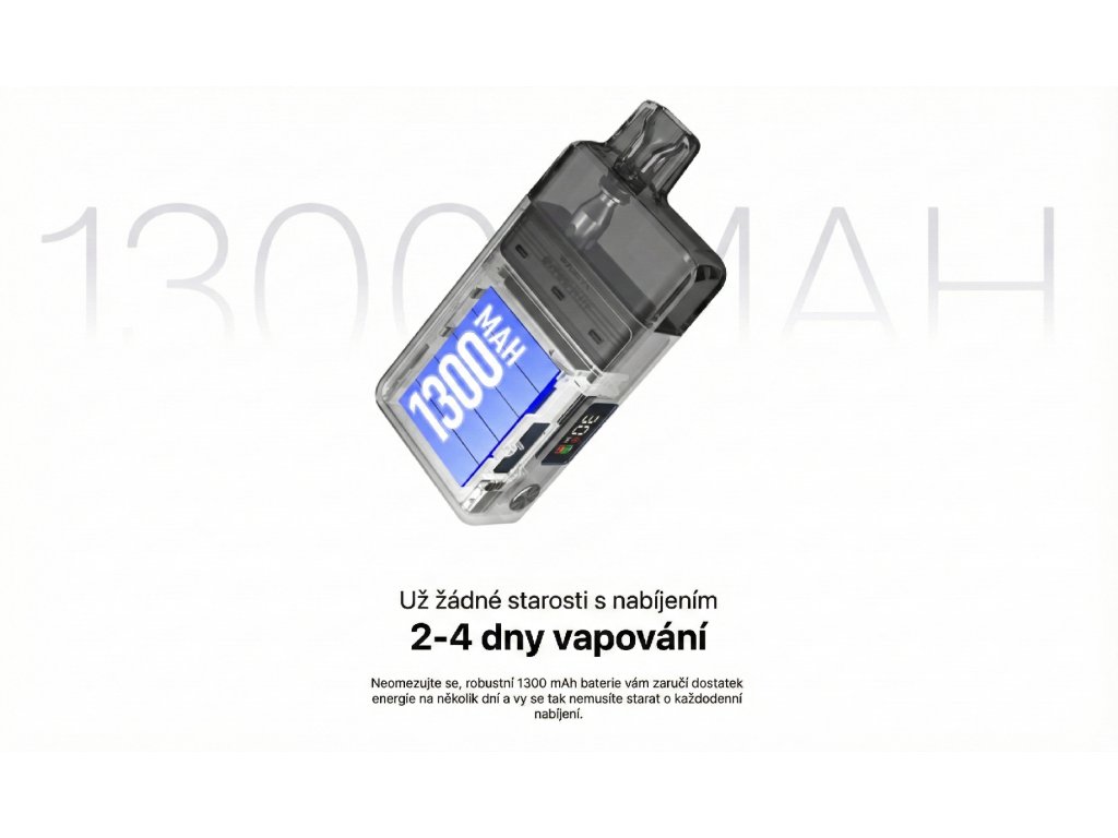 Stylový POD s obrovskou, 8 ml kapacitou, integrovanou baterií o kapacitě 1300mAh, výkonem 30W, rychlým USB-C nabíjením a možností manuálního (tlačítkem) či automatického žhavení (potahem).
