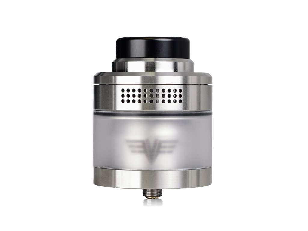 O příjemný vzhled se stará přímočará nerezová konstrukce, jejímž vrcholu dominuje na schodku usazený delrinový driptip 810 a v nižším středu pak polykarbonátové „sklíčko“. Horní část obsahuje odnímatelný topcap, ukrývající plnící otvory a pod ním se nachází otočný airflow kroužek, obsahující celkem 66 dělených otvorů ve dvou částech.